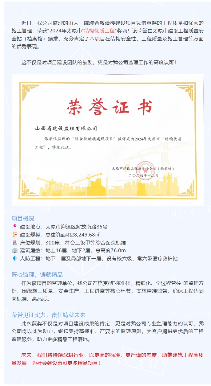 荣誉见证实力 | 我公司监理的山大一院综合救治楼建设项目荣获“结构优质工程”奖!