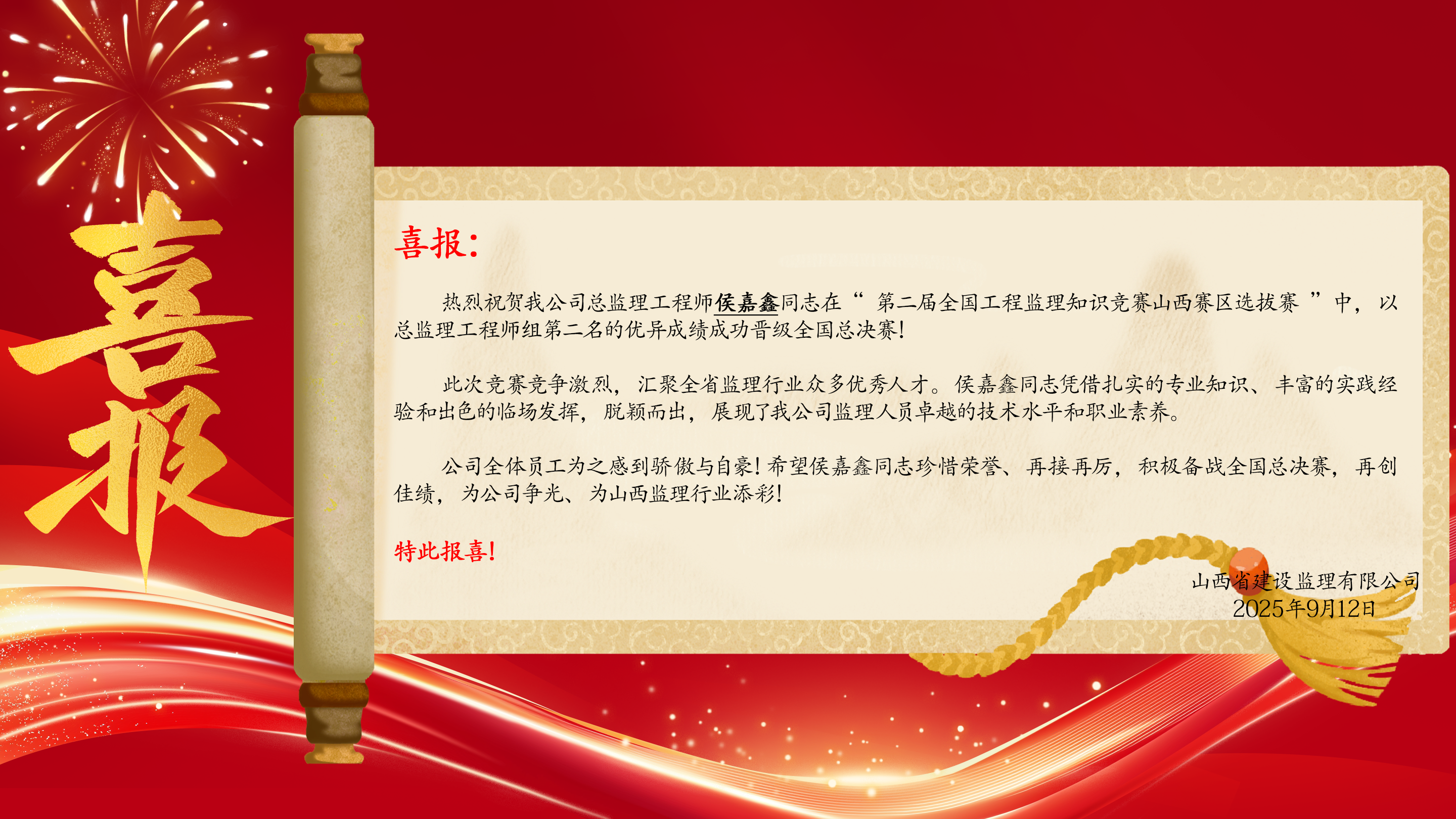 我公司员工侯嘉鑫荣获“第二届全国工程监理知识竞赛”优秀奖